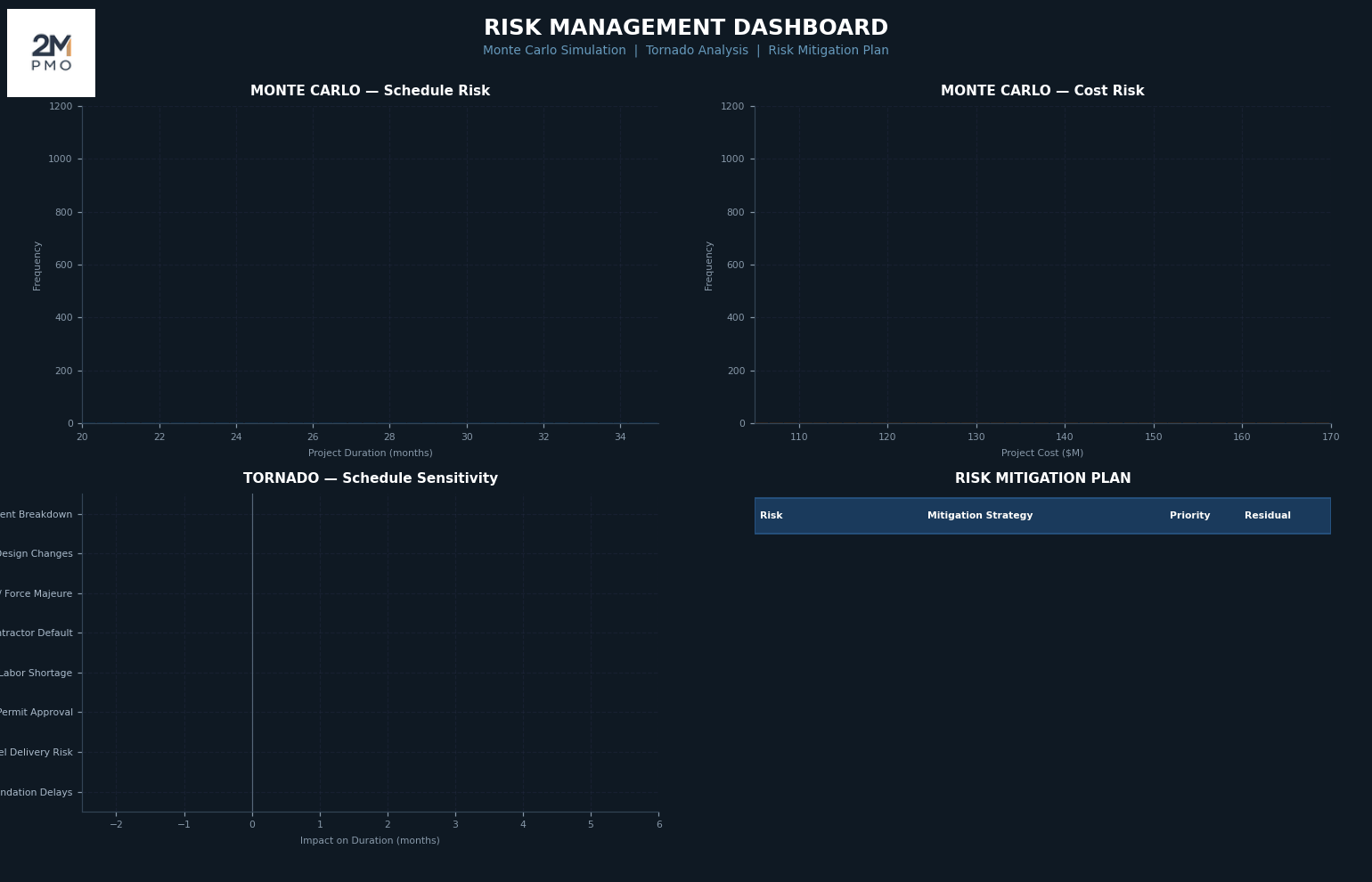 Monte Carlo simülasyonu ile kantitatif risk analizi, risk kayıt defteri oluşturma ve kritik yolu ve proje bütçesini koruyan risk azaltma planlaması.
